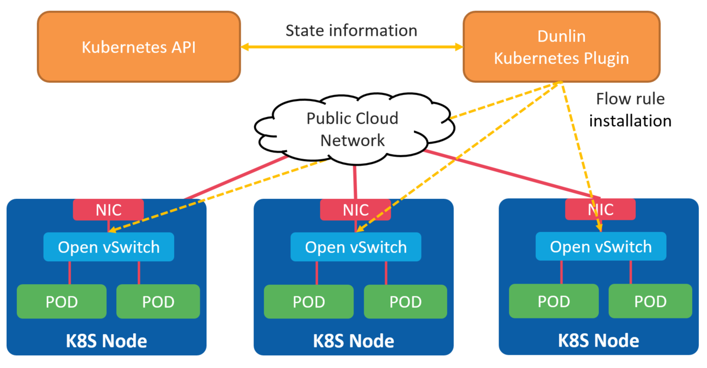 Our Kubernetes network plugin is based on Open vSwitch since it was designed to work in high-speed and complex network scenarios. Our SDN controller watches the Kubernetes API for changes in the cluster regarding PODs, services, nodes and security policies. Then, for every atomic change in the cluster it installs the proper networking rule using the OpenFlow protocol.